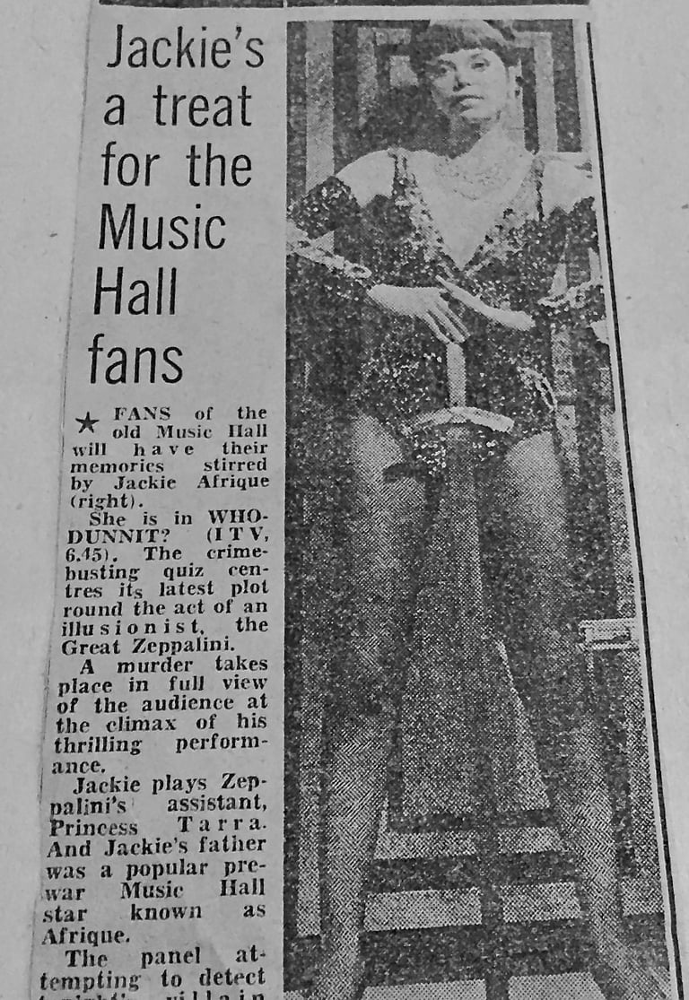 "Jacqui is a treat for Music Hall fans.Fans of Music Hall will certainly have their memories stirred by Jacqui Alexander. She is starring in Who-dunnit? on ITV this week."