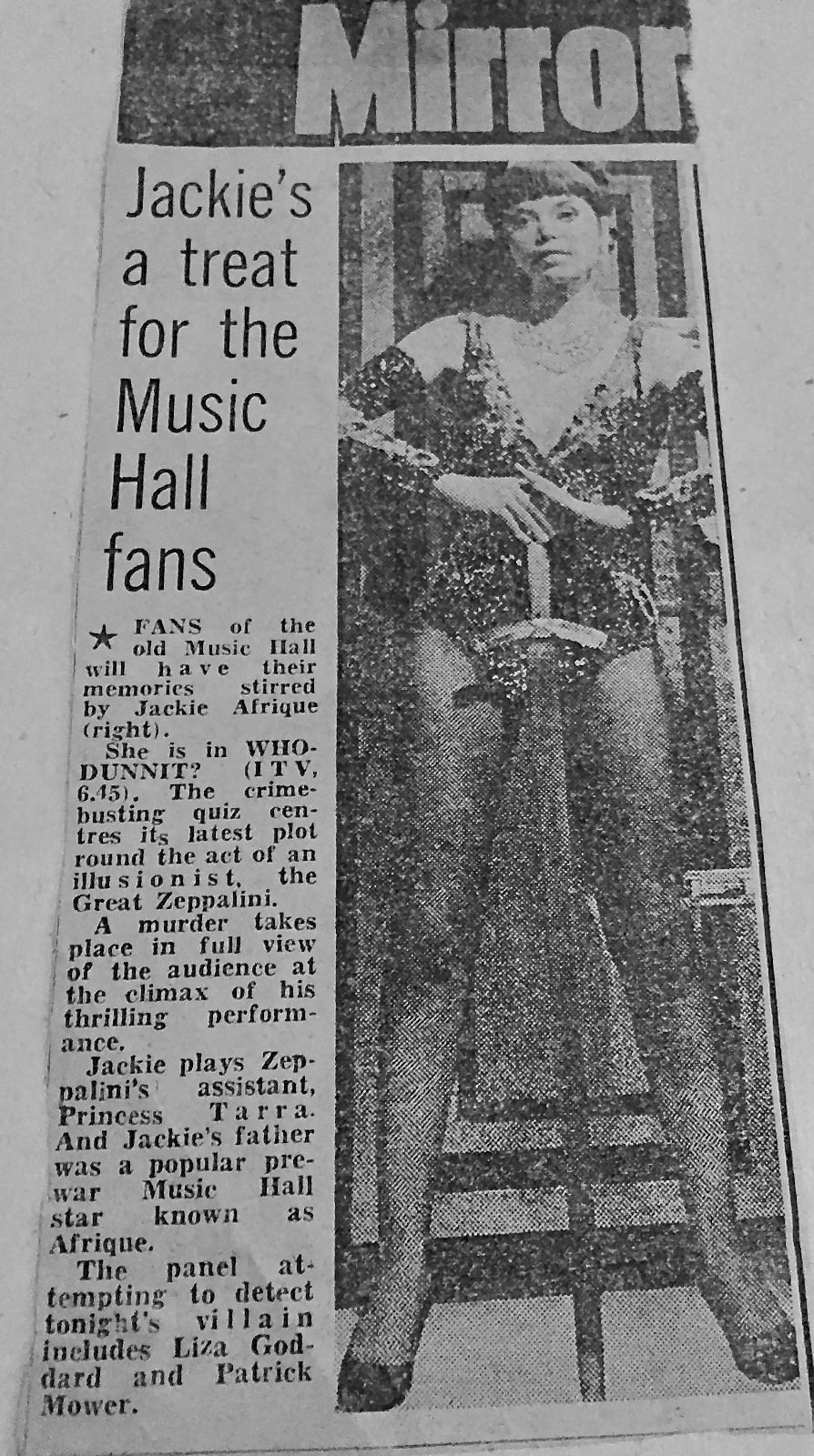 "Jacqui is a treat for Music Hall fans.Fans of Music Hall will certainly have their memories stirred by Jacqui Alexander. She is starring in Who-dunnit? on ITV this week."